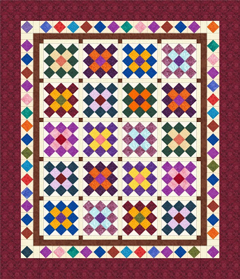 Here's one of my latest scrap busting quilts. This quilt top measures 58" x 67-1/2" so it would considered a throw or lap size. I used over 300 2-1/2" squares of various scrap fabrics. The Granny Square blocks (aka Arbor Window) are arranged in a 4 x 5 layout. There are three borders, one of which is comprised of pieced square-in-a-square blocks also using scrap fabrics.